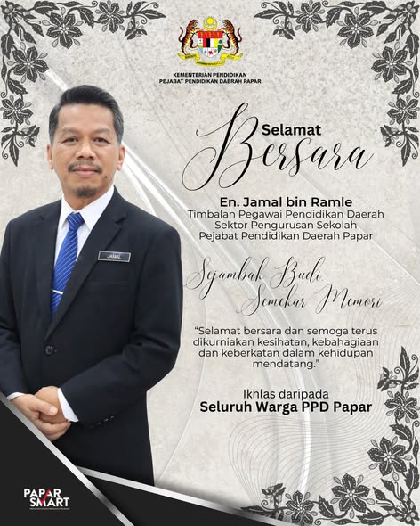 Pejabat Pendidikan Daerah Papar merakamkan setinggi-tinggi penghargaan dan ucapan terima kasih kepada Cikgu Jamal bin Ramle atas jasa dan sumbangan beliau yang amat besar dalam dunia pendidikan, khususnya di daerah Papar.
