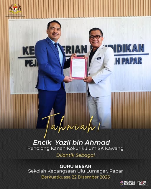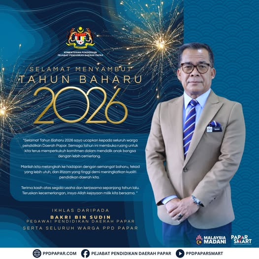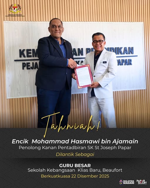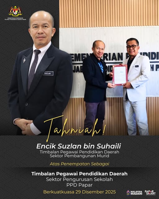 Pejabat Pendidikan Daerah Papar merakamkan setinggi-tinggi tahniah kepada semua penerima surat kenaikan pangkat Pegawai Perkhidmatan Pendidikan secara Time-Based Berasaskan Kecemerlangan. Majlis penuh bermakna ini telah berlangsung pada 3 Disember 2025 (Rabu), jam 2.00 petang di Bilik Mawar, Aras 3, PPD Papar, dan telah disempurnakan oleh Encik Bakri bin Sudin, Pegawai Pendidikan Daerah Papar.